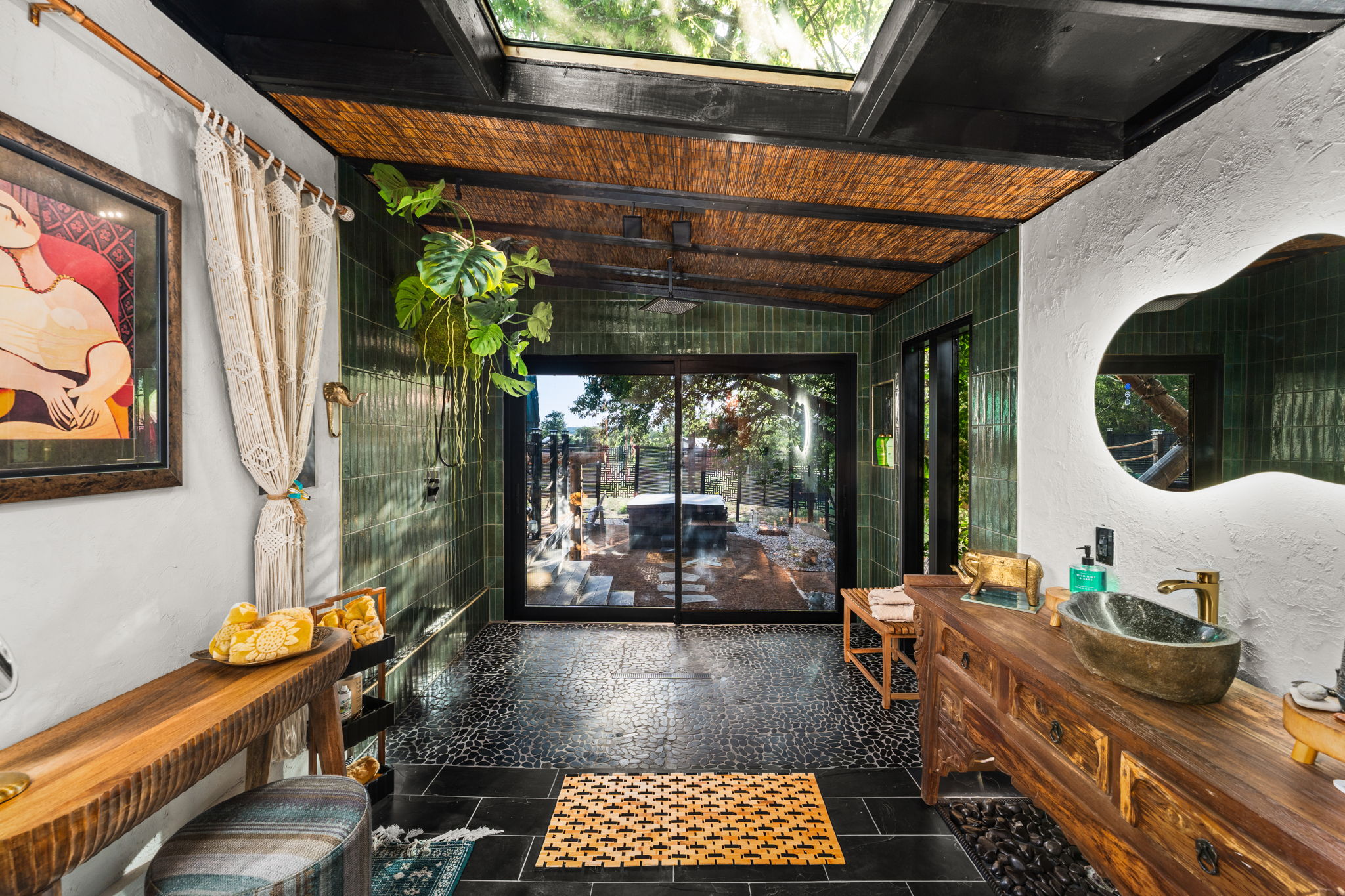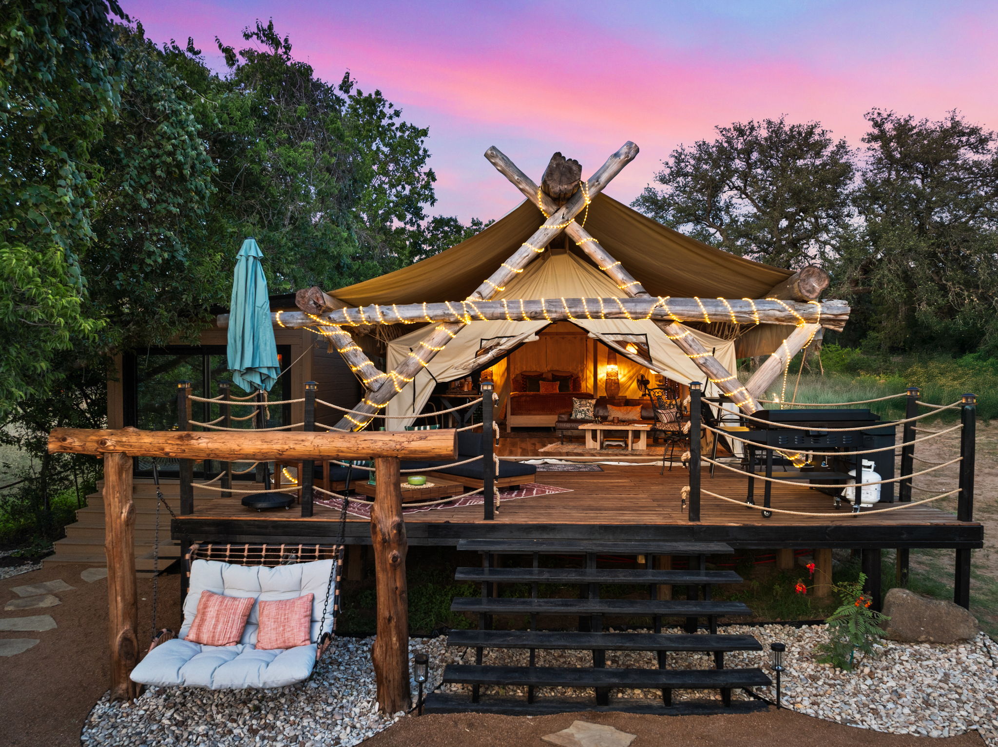 Step into Sabi Nights, our most luxurious safari tent yet perfect for extended stays and people who want a more elevated glamping experience—a dreamy 460 sq. ft. retreat designed for couples to reconnect and recharge in style. With a seamless blend of modern chic and Balinese influences, this private oasis offers everything you need for a magical Hill Country escape.